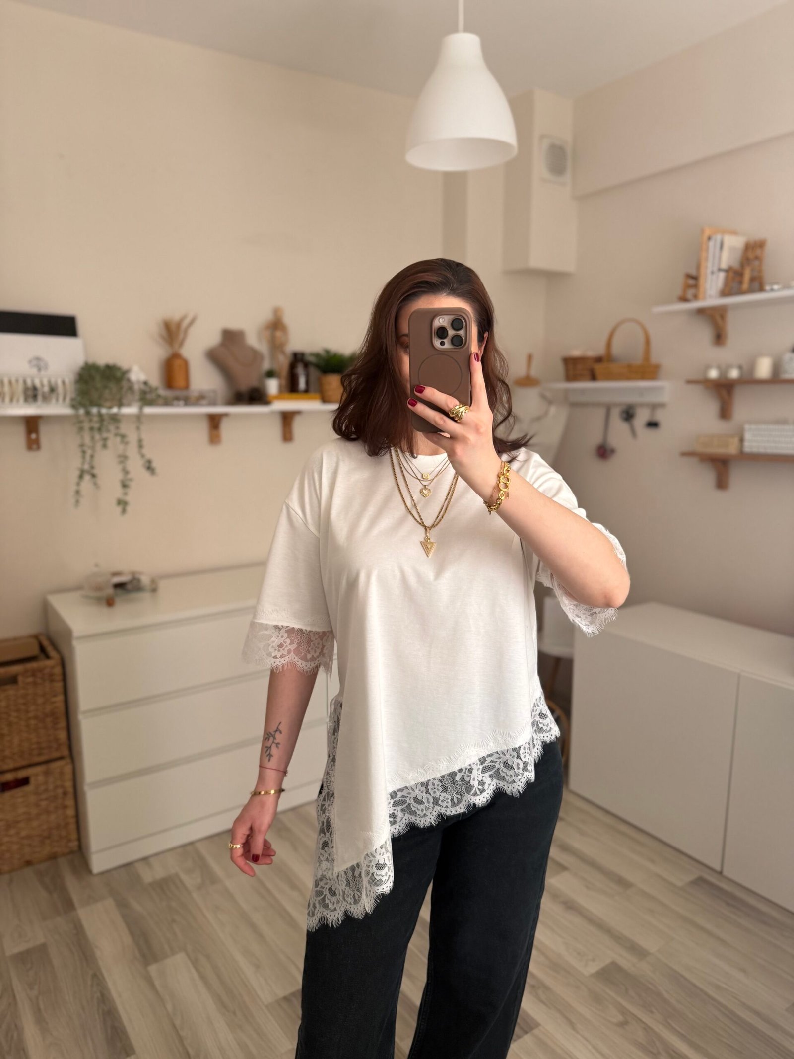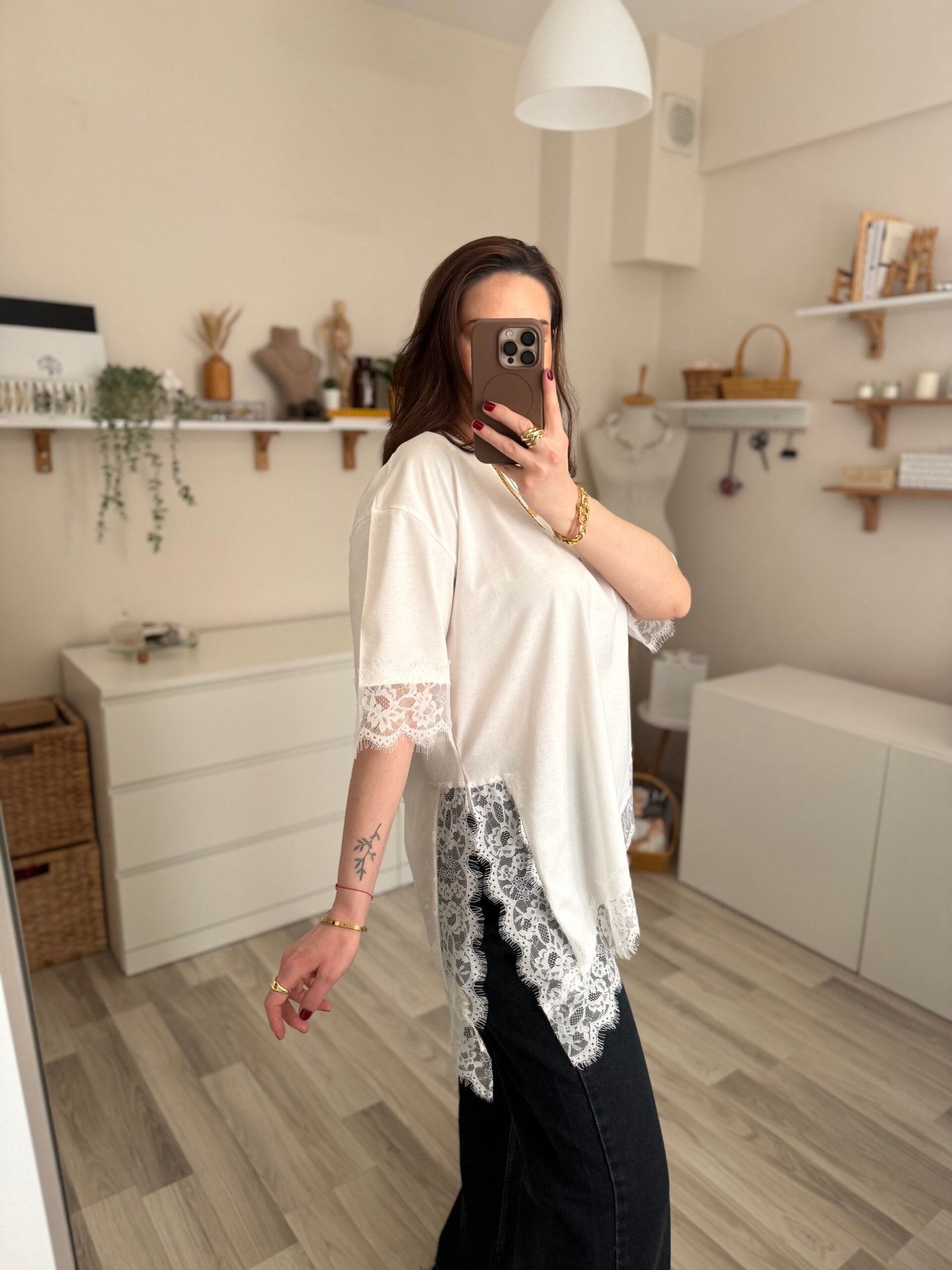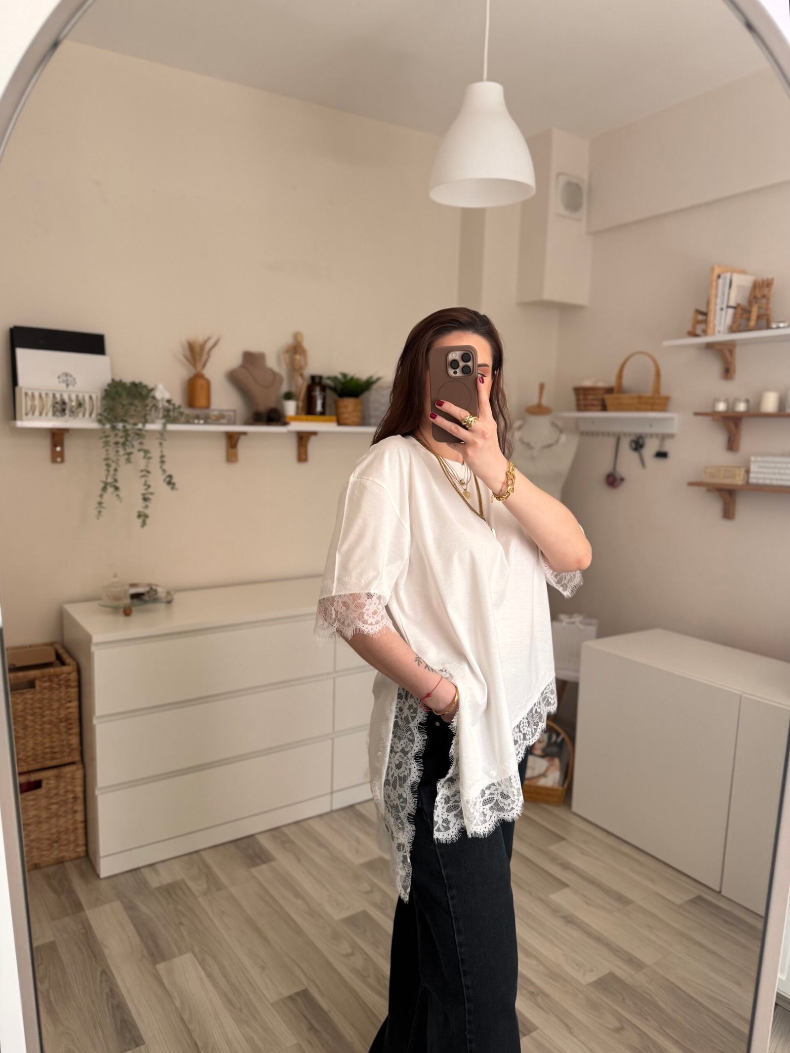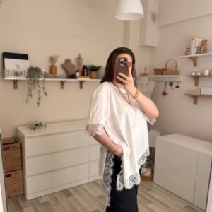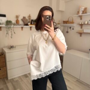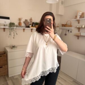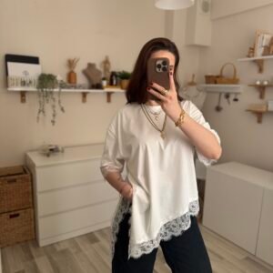 Günlük şıklığı modern bir dokunuşla yeniden yorumlayan asimetrik kesim yırtmaçlı dantel detaylı kadın tişört, stiline farklılık katmak isteyenler için tasarlandı. Özgün kesimi sayesinde klasik tişörtlerden ayrılırken, zarif dantel detayları feminen bir hava kazandırır.