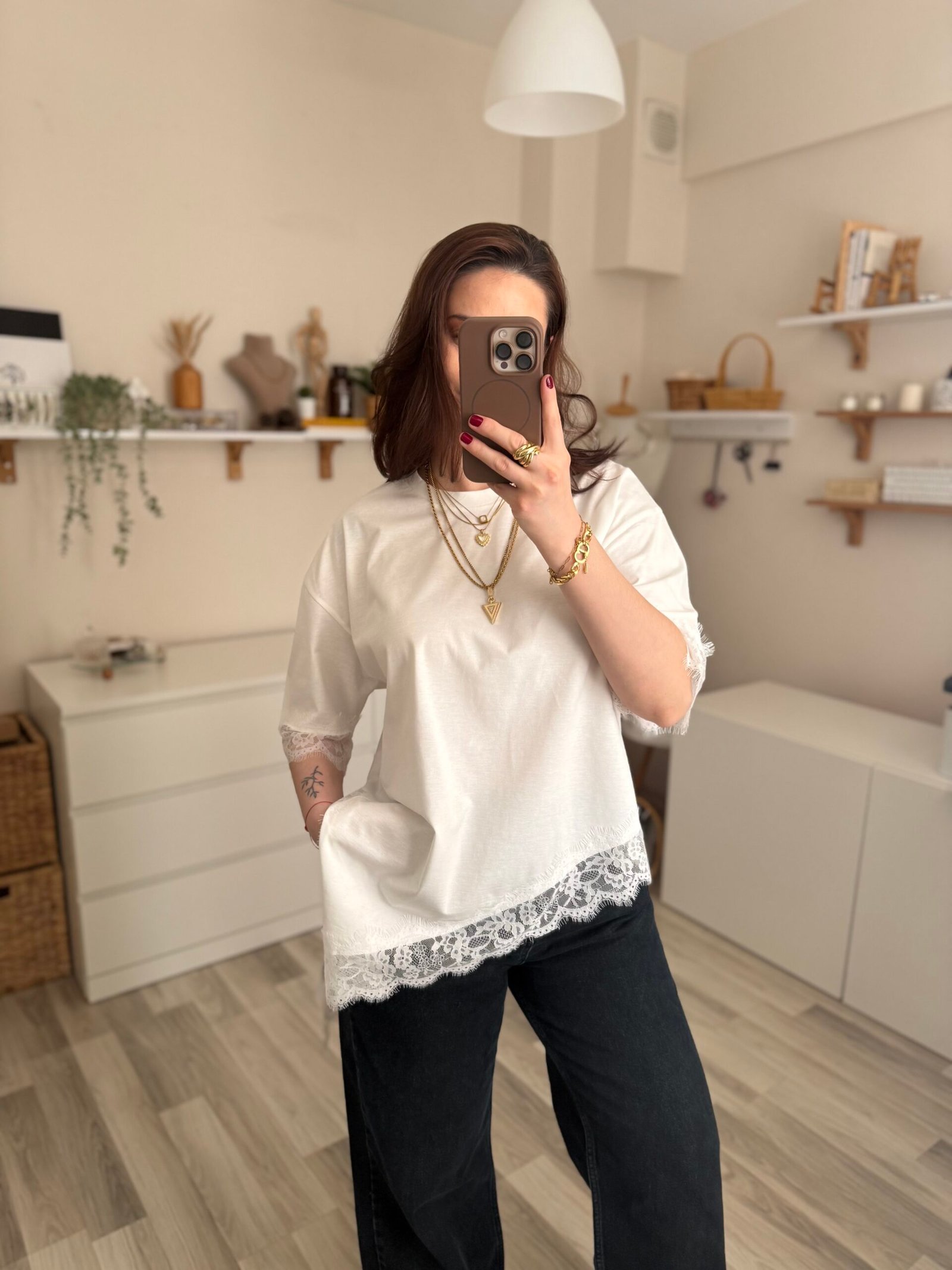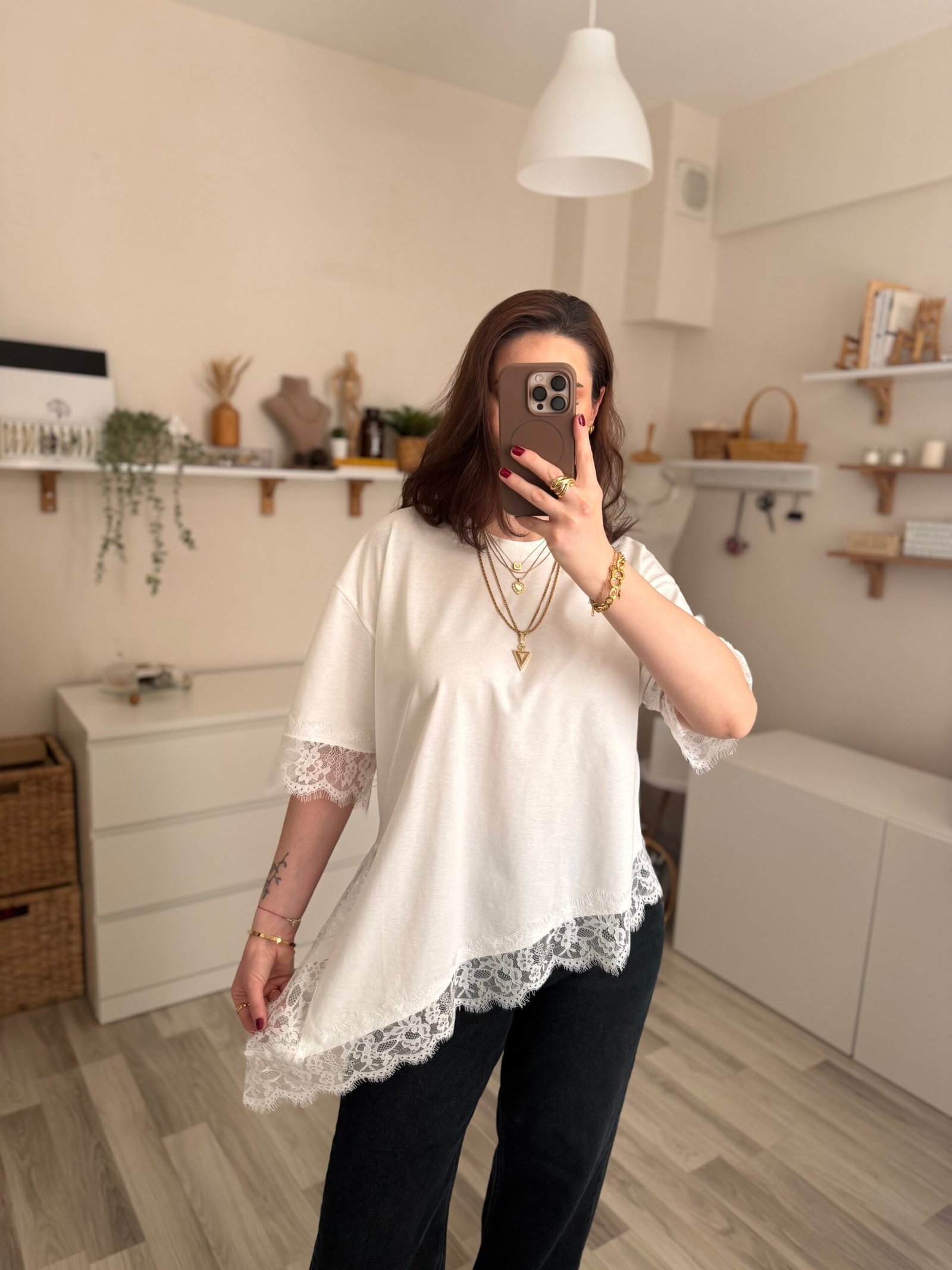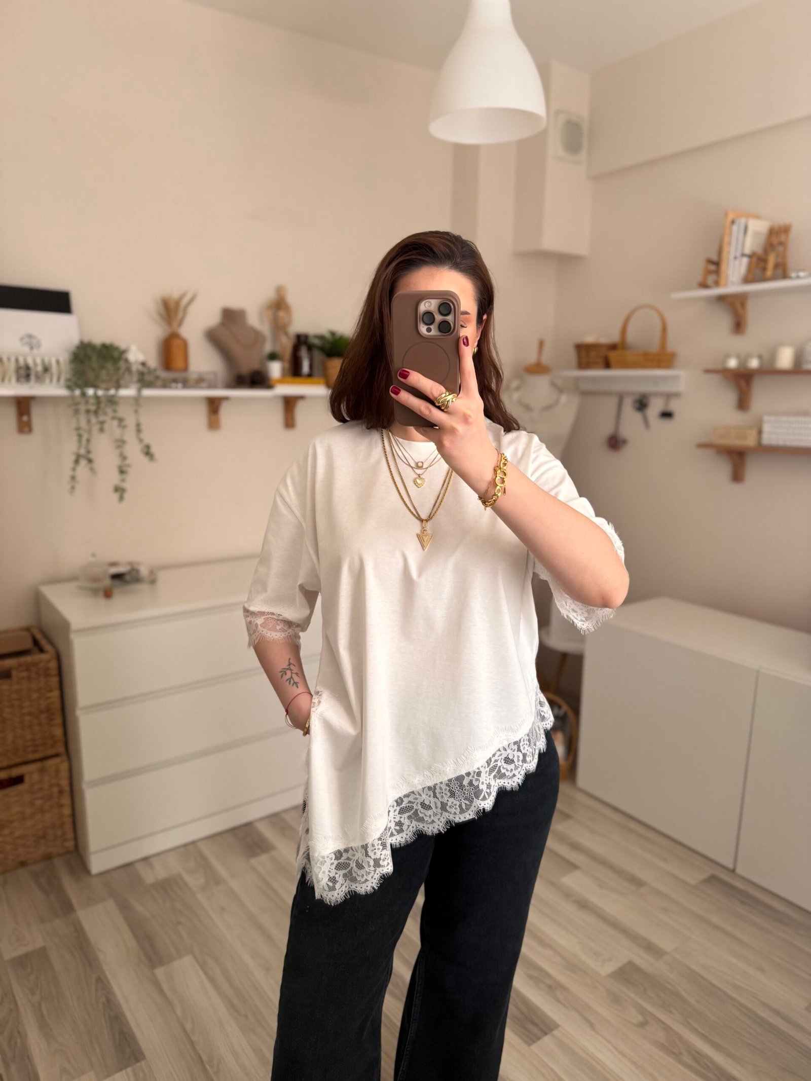 Günlük şıklığı modern bir dokunuşla yeniden yorumlayan asimetrik kesim yırtmaçlı dantel detaylı kadın tişört, stiline farklılık katmak isteyenler için tasarlandı. Özgün kesimi sayesinde klasik tişörtlerden ayrılırken, zarif dantel detayları feminen bir hava kazandırır.