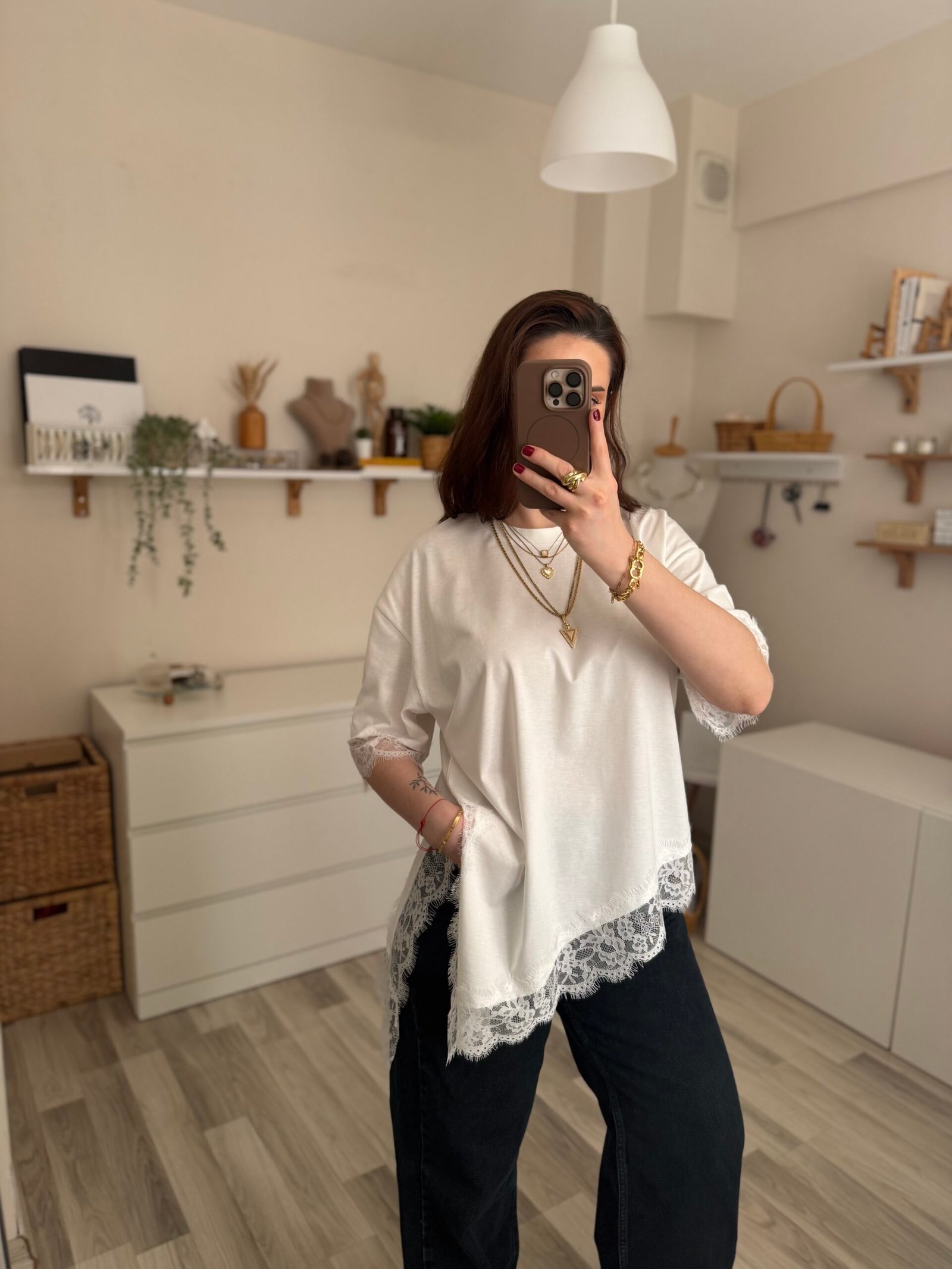 İlk yorum yapan siz olun “Asimetrik Kesim Yırtmaçlı Dantel Detaylı Beyaz Kadın Tişört”