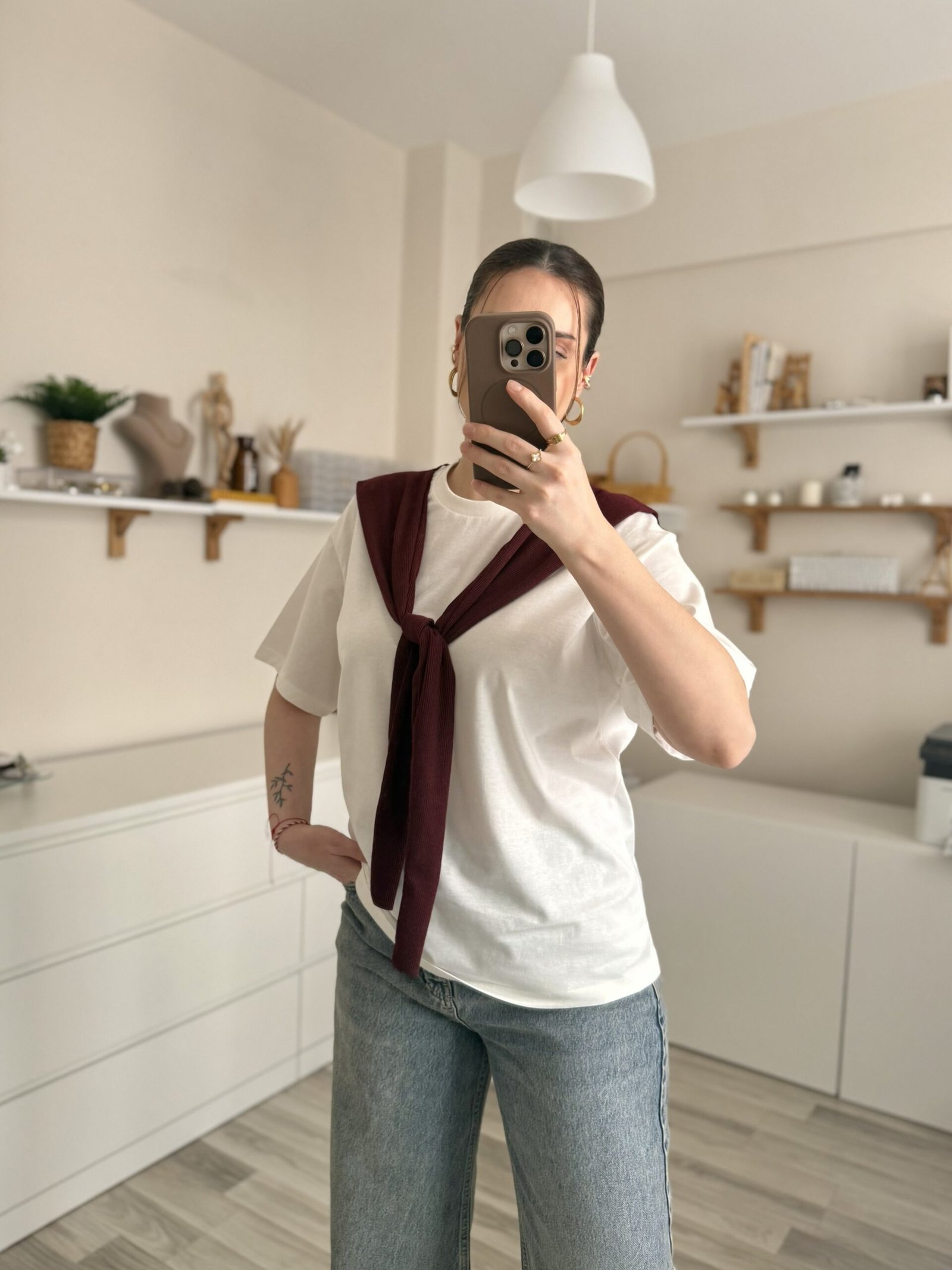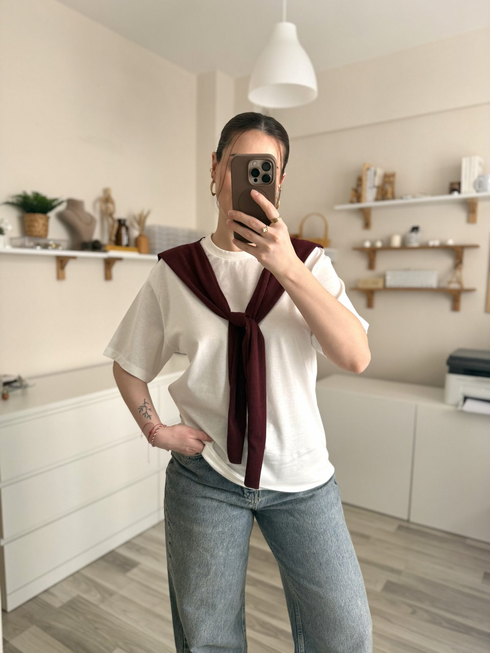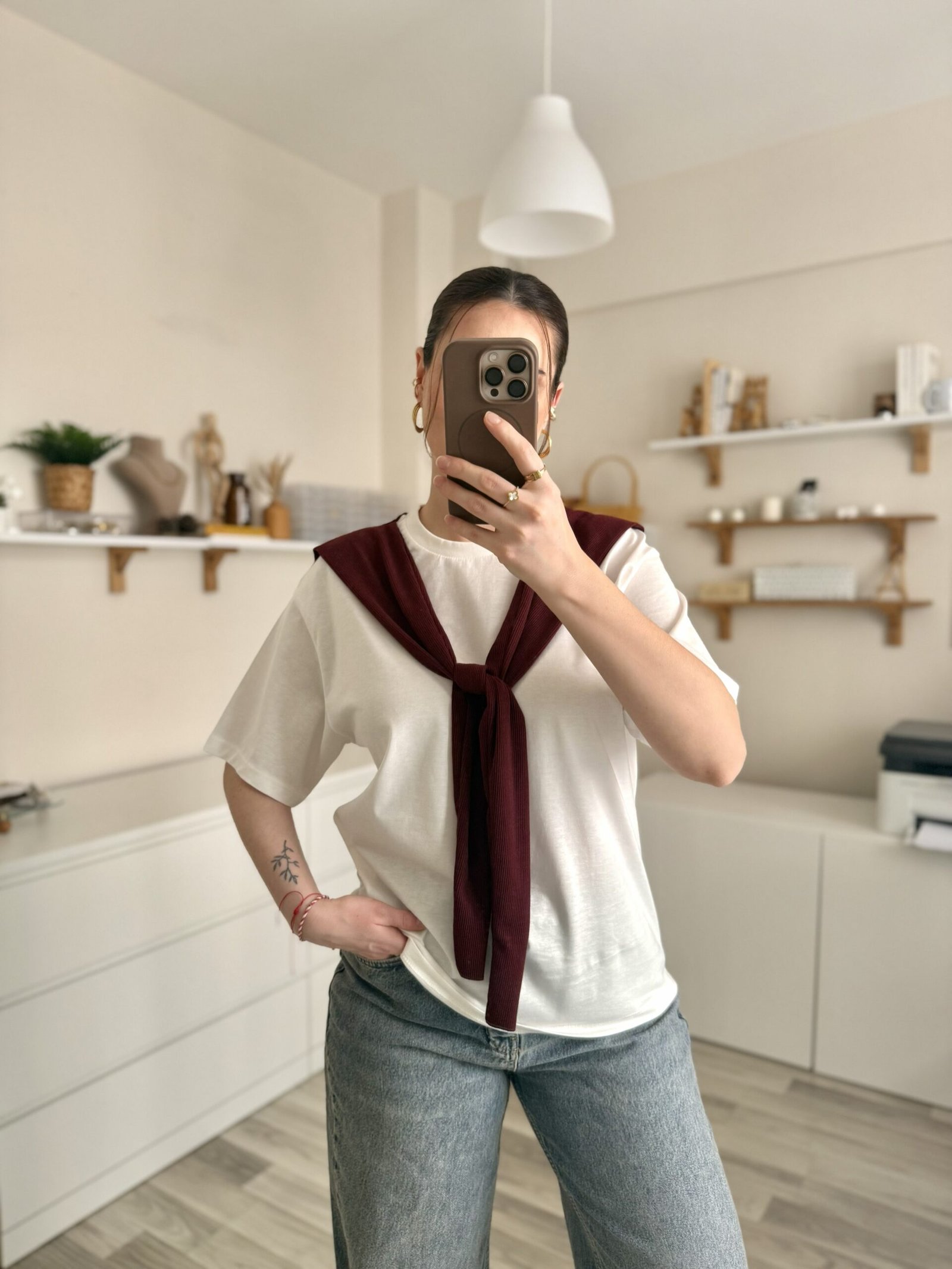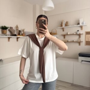 Şal bağlama detayıyla fark yaratan bu oversize tişört, pamuklu dokusu sayesinde gün boyu konfor sağlar. Bordo, siyah ve kahverengi renk seçenekleriyle hem günlük hem şık kombinler için ideal.