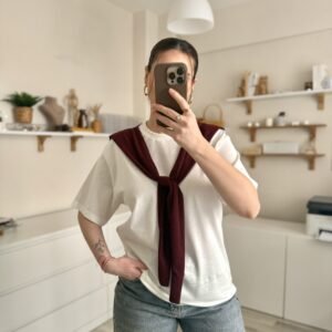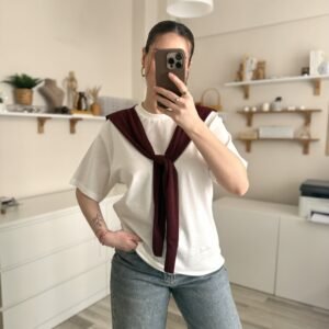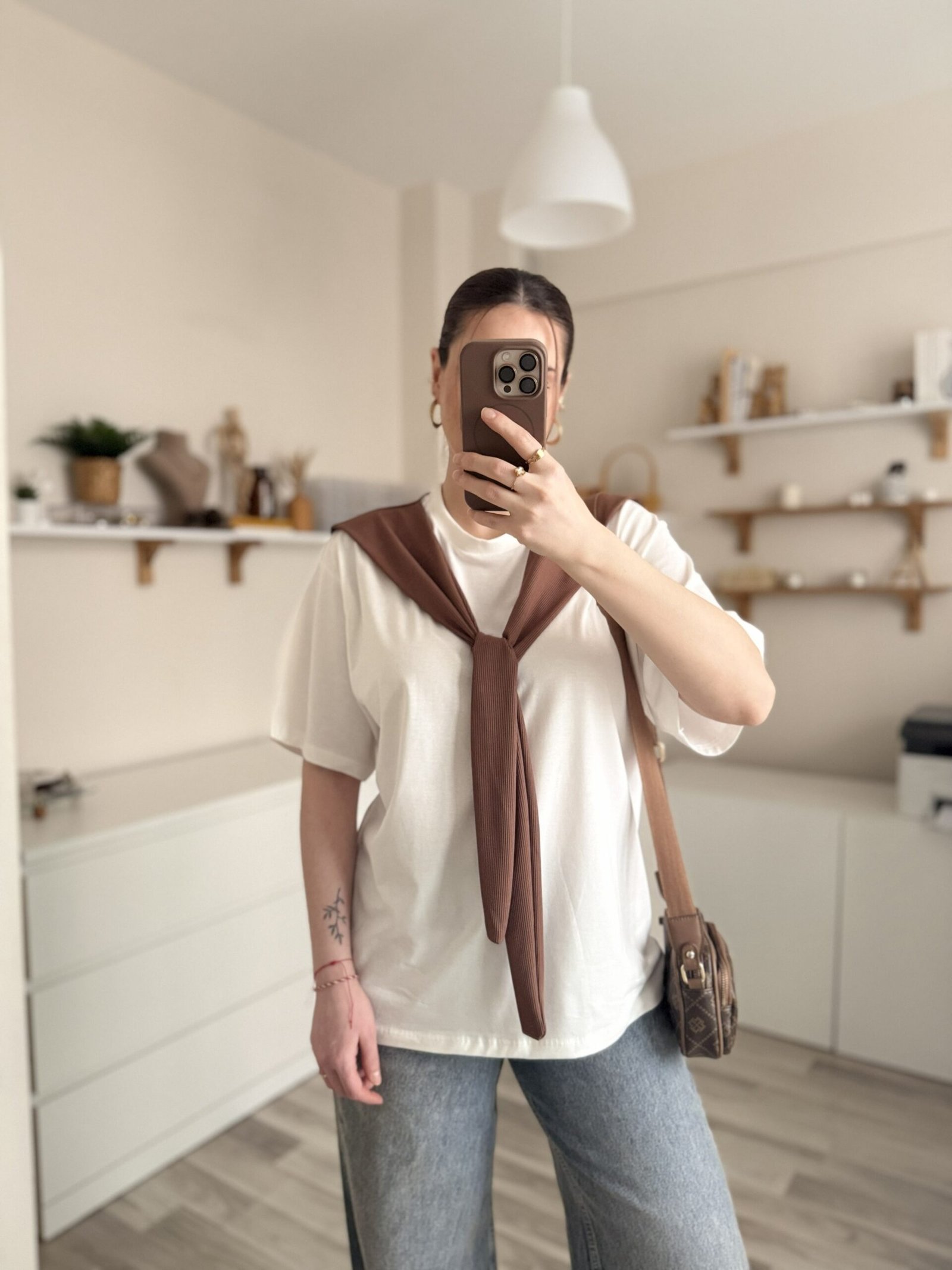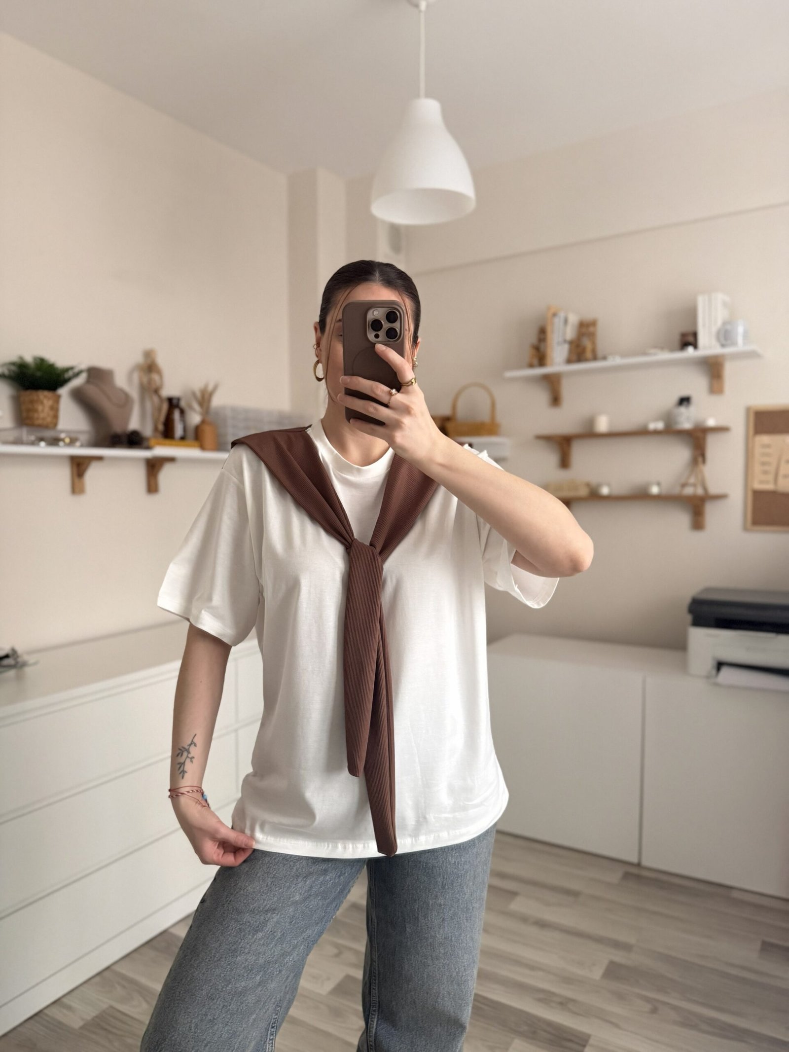 Şal bağlama detayıyla fark yaratan bu oversize tişört, pamuklu dokusu sayesinde gün boyu konfor sağlar. Bordo, siyah ve kahverengi renk seçenekleriyle hem günlük hem şık kombinler için ideal.