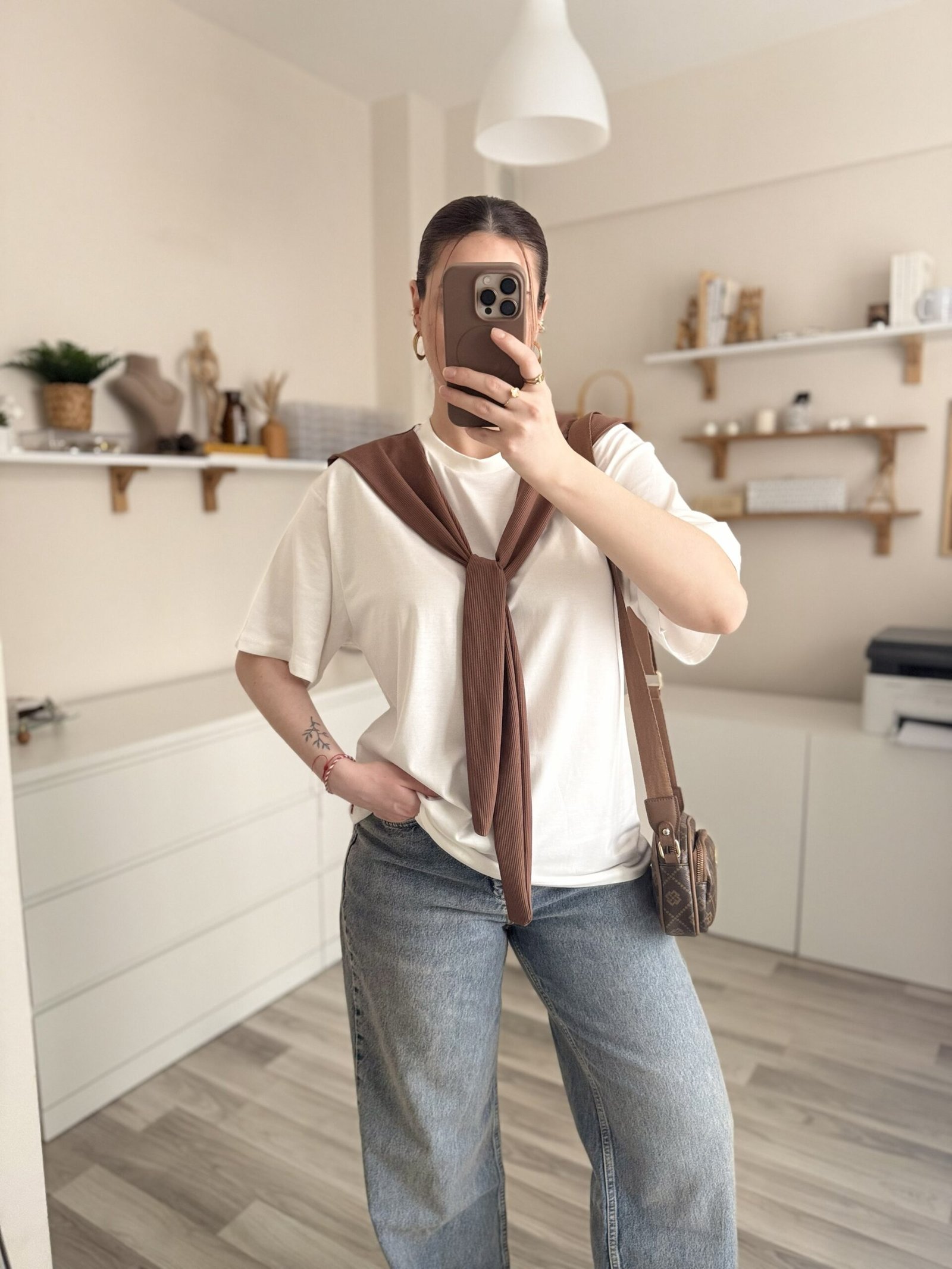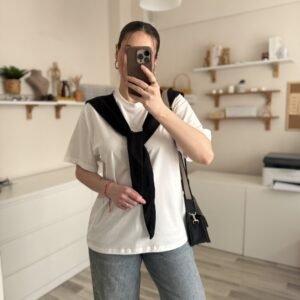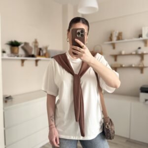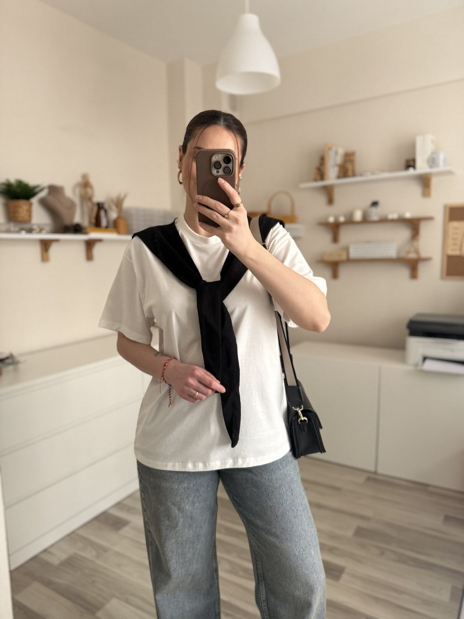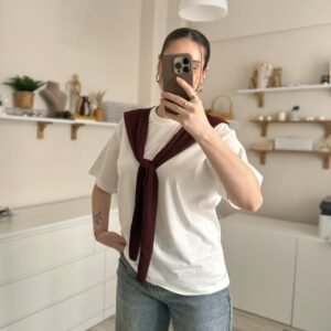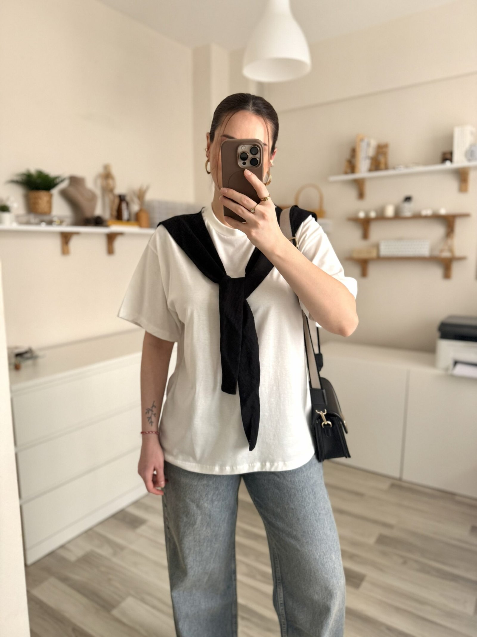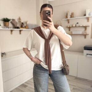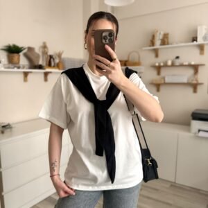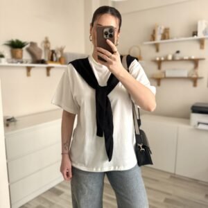 Ön kısmındaki şal bağlama detayı, basic tişörtlere şık ve farklı bir dokunuş katar. Günlük kombinlerden ofis stiline kadar geniş kullanım alanı sunan bu model; jean, şort veya eteklerle kolayca uyum sağlar.