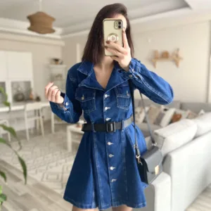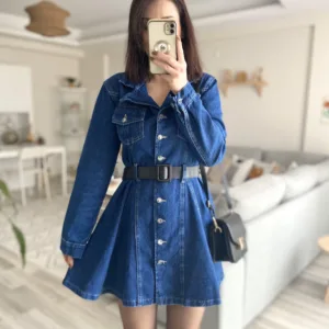 Modern çizgileriyle öne çıkan Kemerli Düğmeli Kot Elbise, sade ama zarif tarzı seven kadınlar için tasarlandı.