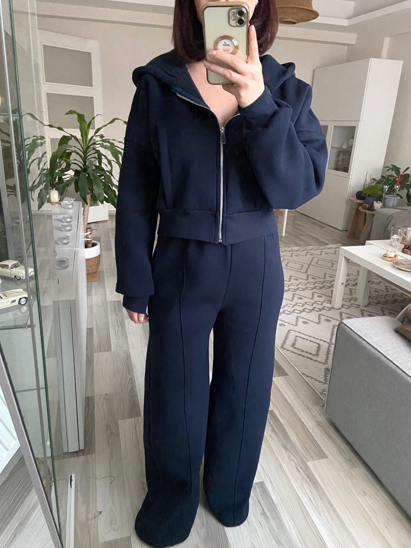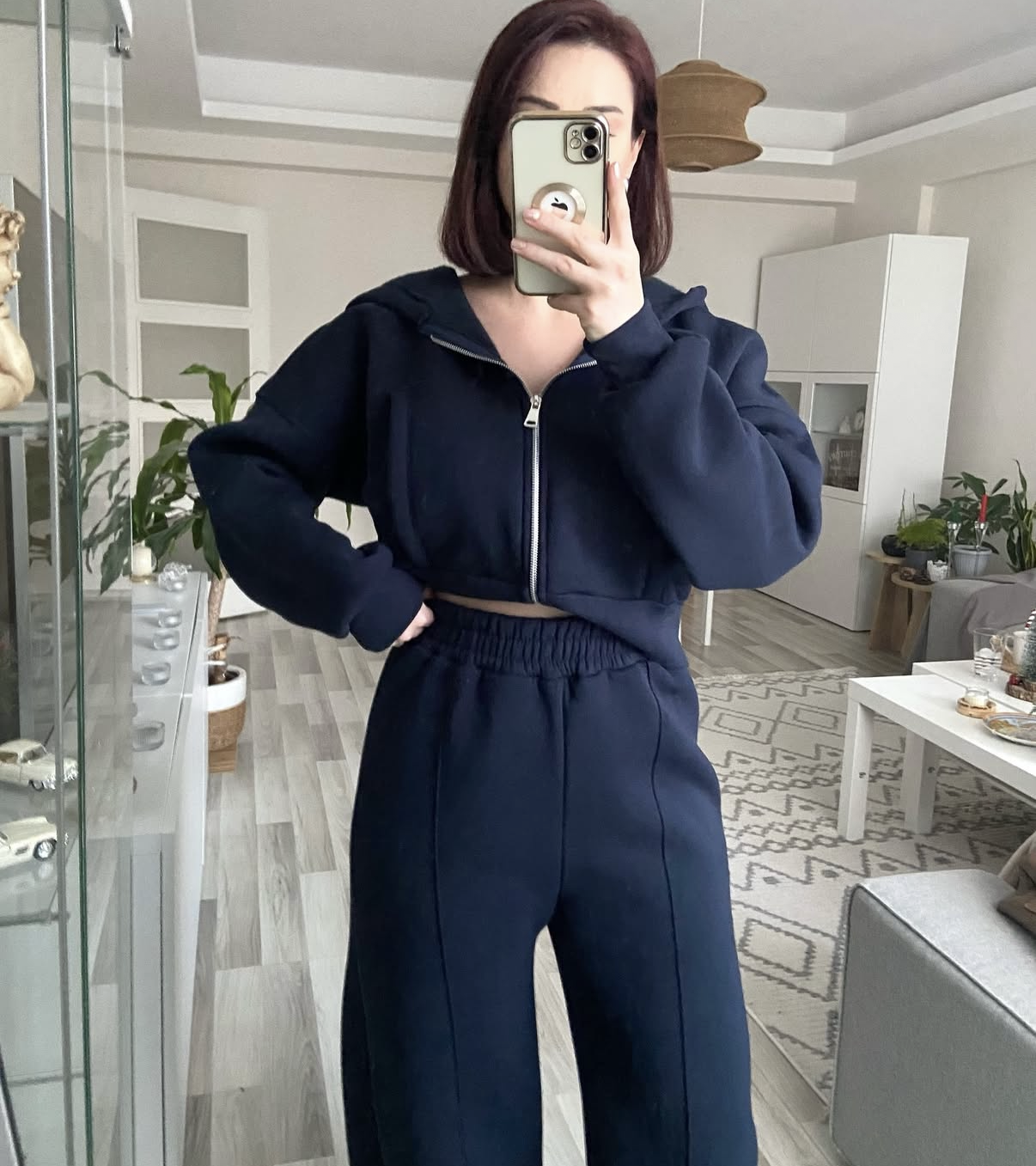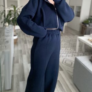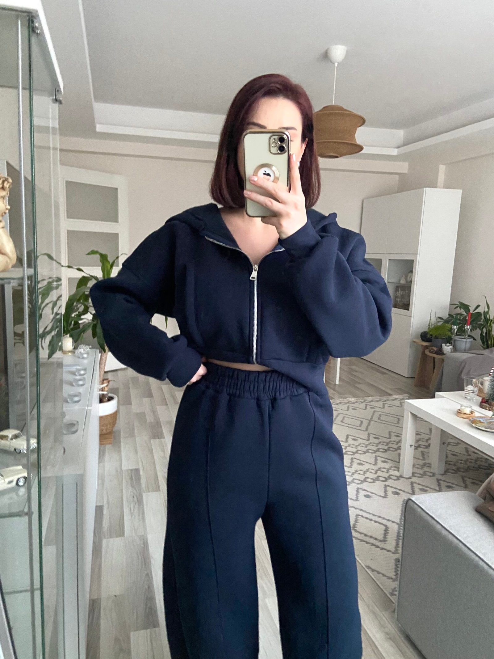 Şardonlu iç yüzeyiyle sıcak tutan, lacivert ve krem renk detaylarıyla zamansız şıklık sunan rahat kesim eşofman takımı.