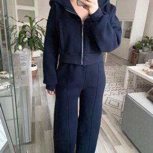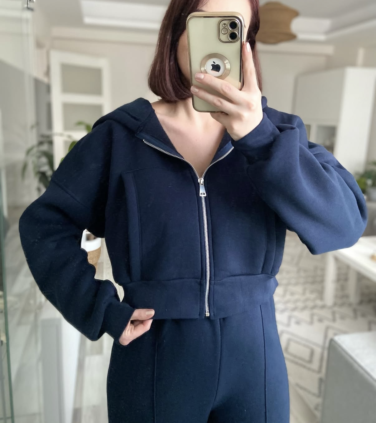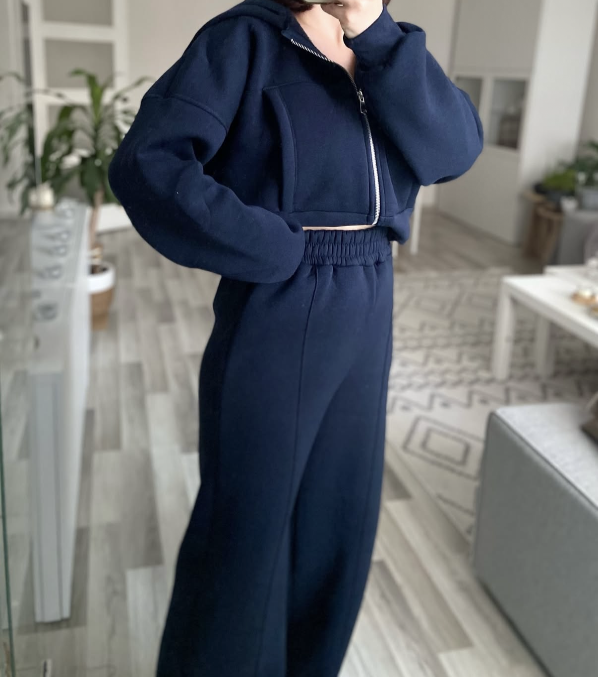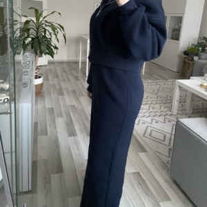 Şardonlu iç yüzeyiyle sıcak tutan, lacivert ve krem renk detaylarıyla zamansız şıklık sunan rahat kesim eşofman takımı.