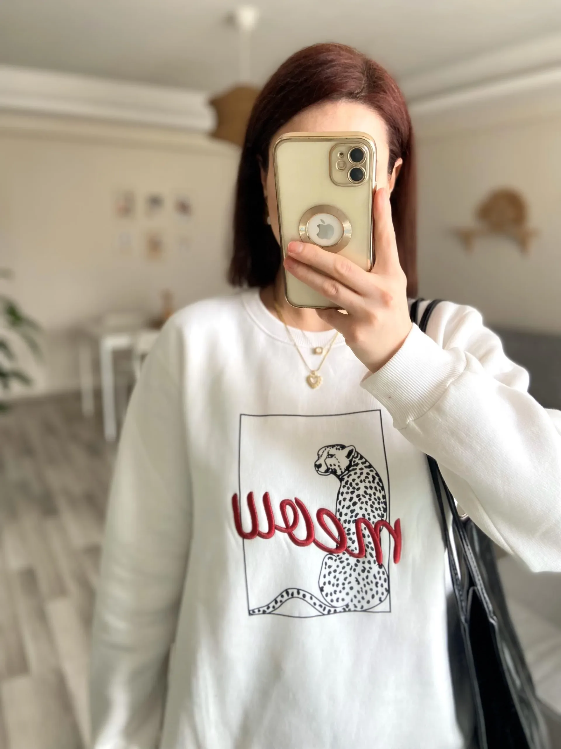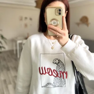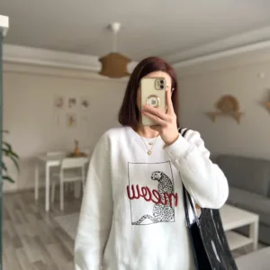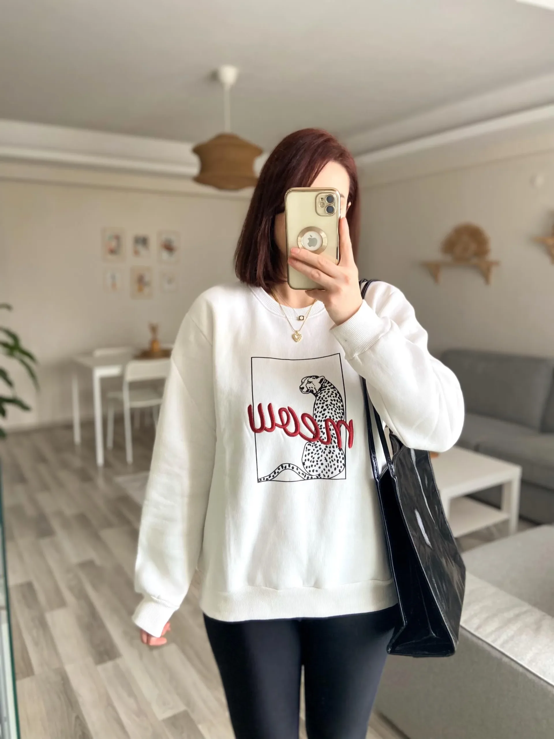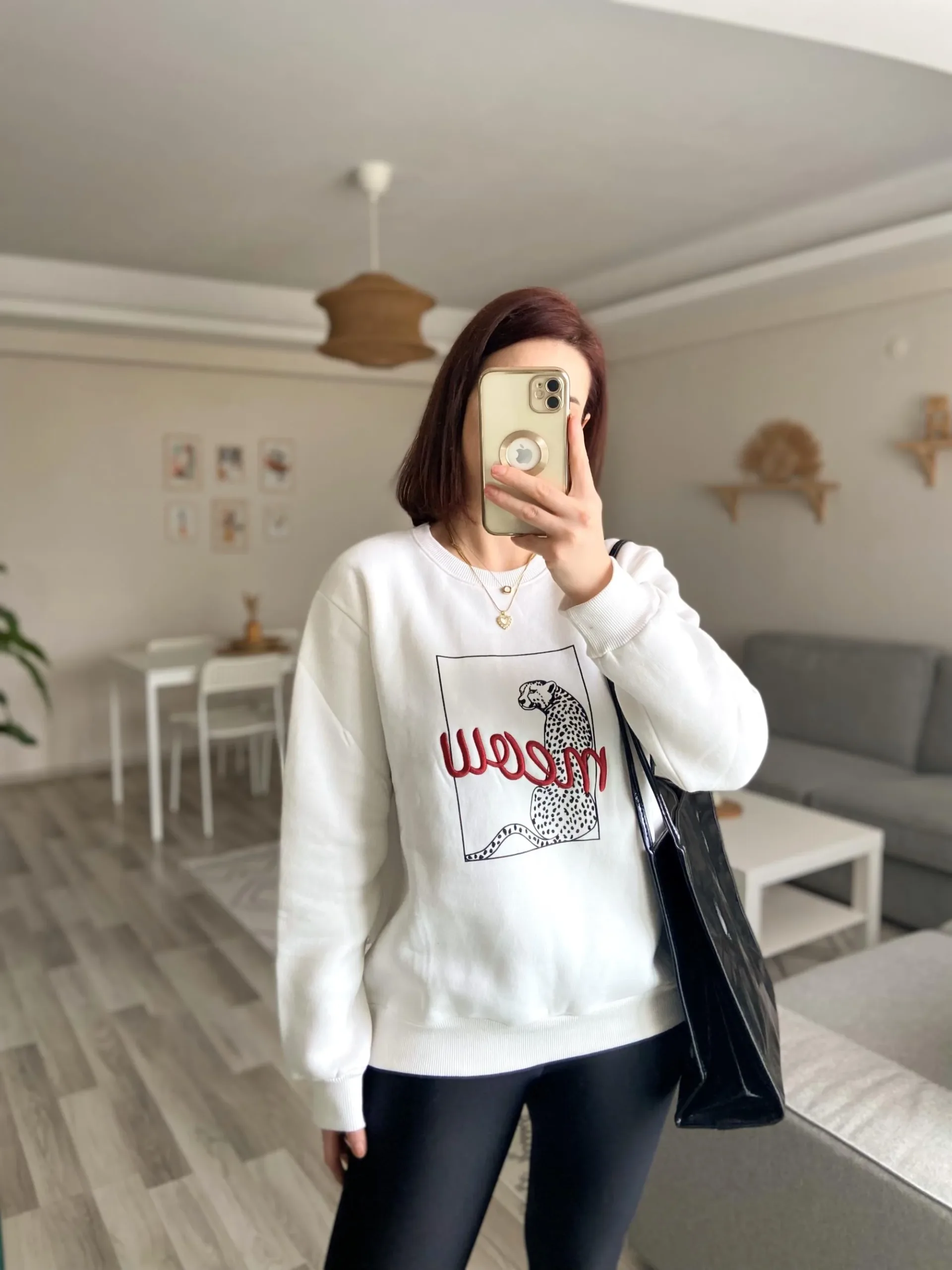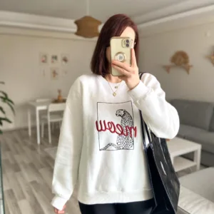 Mevsim geçişlerinde veya serin günlerde ideal bir seçim olan bu beyaz sweatshirt, hem konforlu hem de trend bir görünüm arayan kadınların favorisi olacak.
