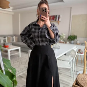 Modern kesimi ve zarif yırtmaç detayıyla dikkat çeken siyah uzun etek.