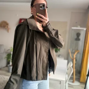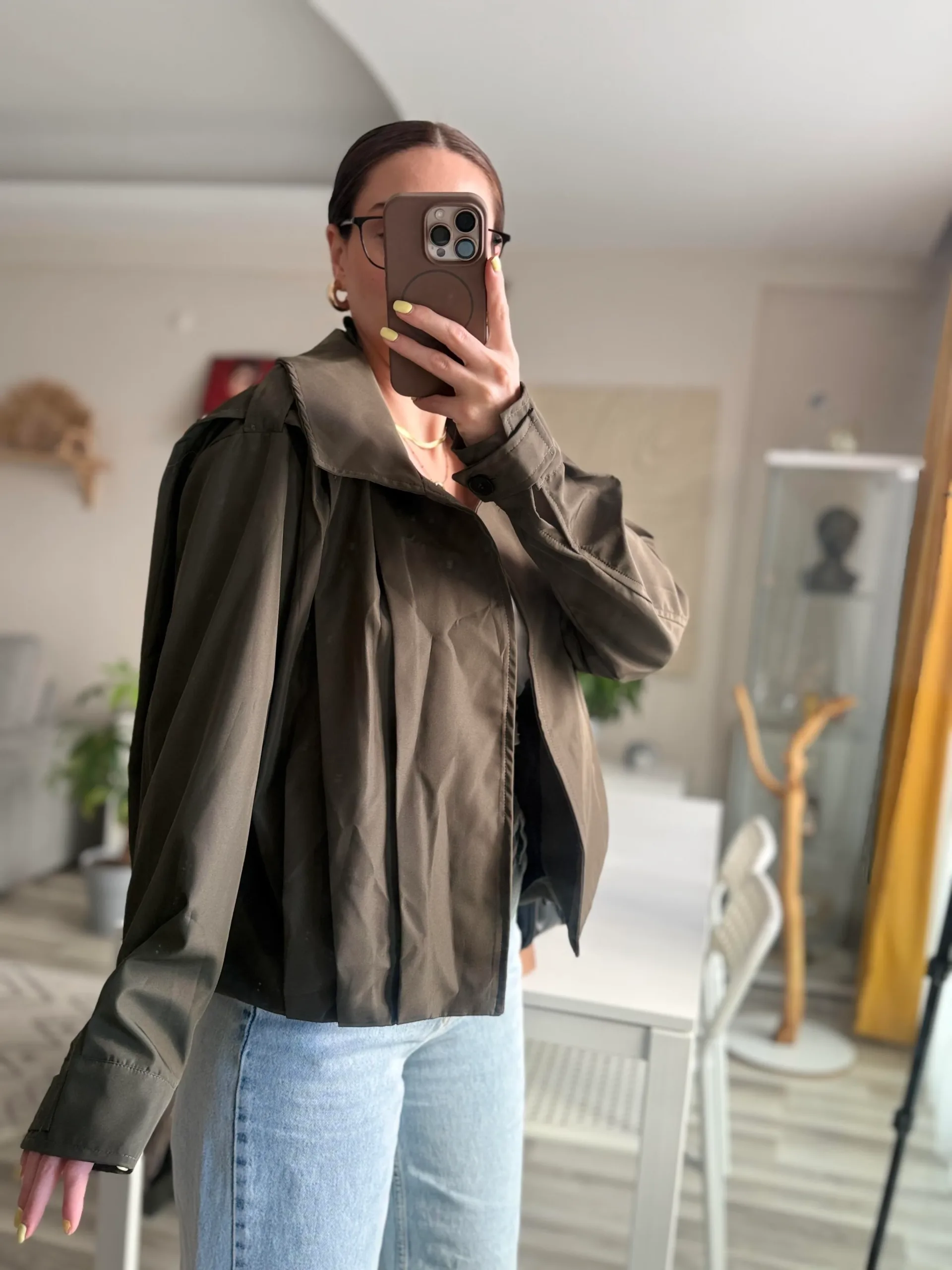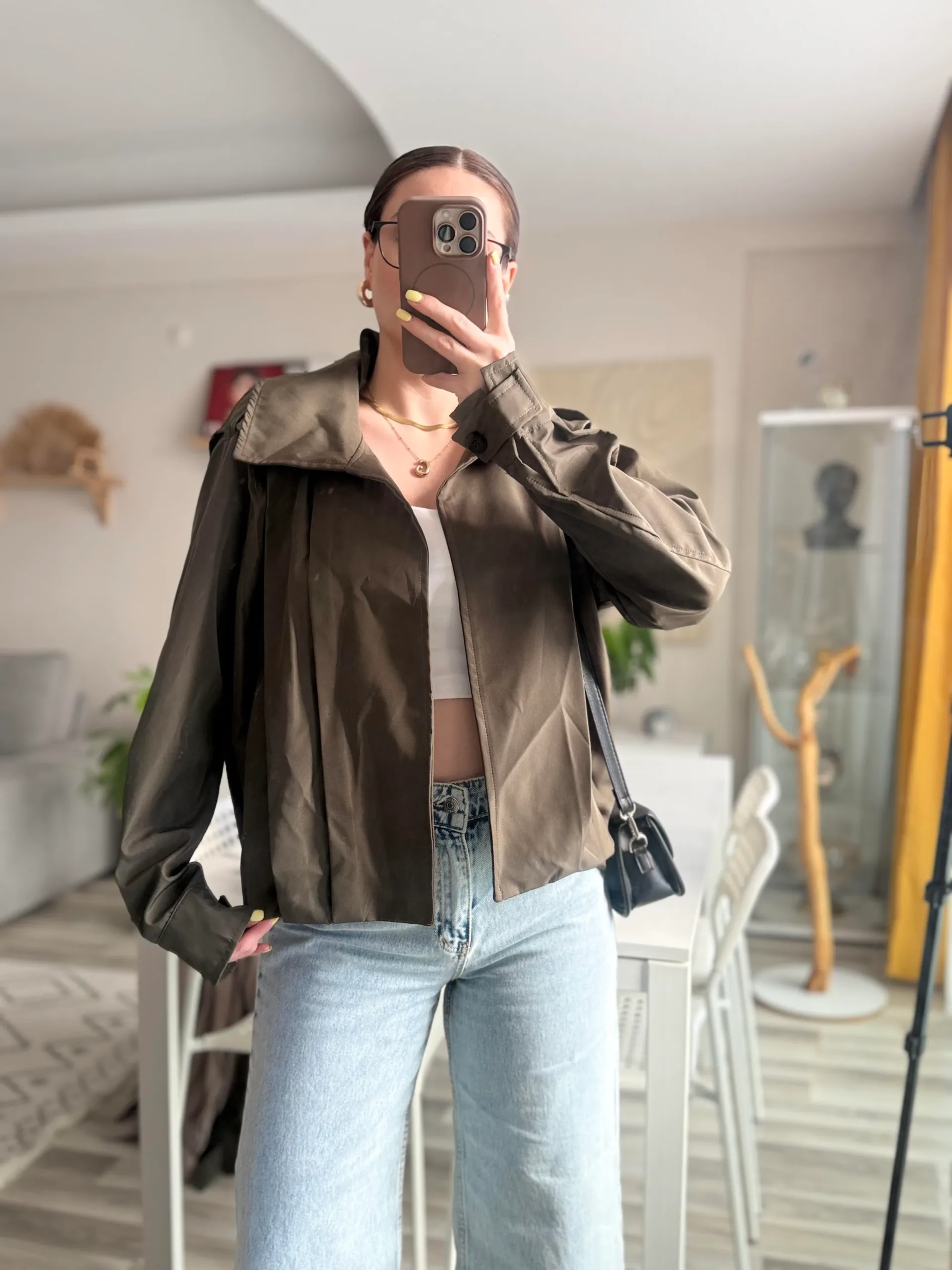 Sneaker ya da topuklu ayakkabılarla farklı şekillerde tamamlayabileceğiniz bu bomber trenç, sade ama dikkat çekici bir görünüm yaratmak isteyenler için ideal.