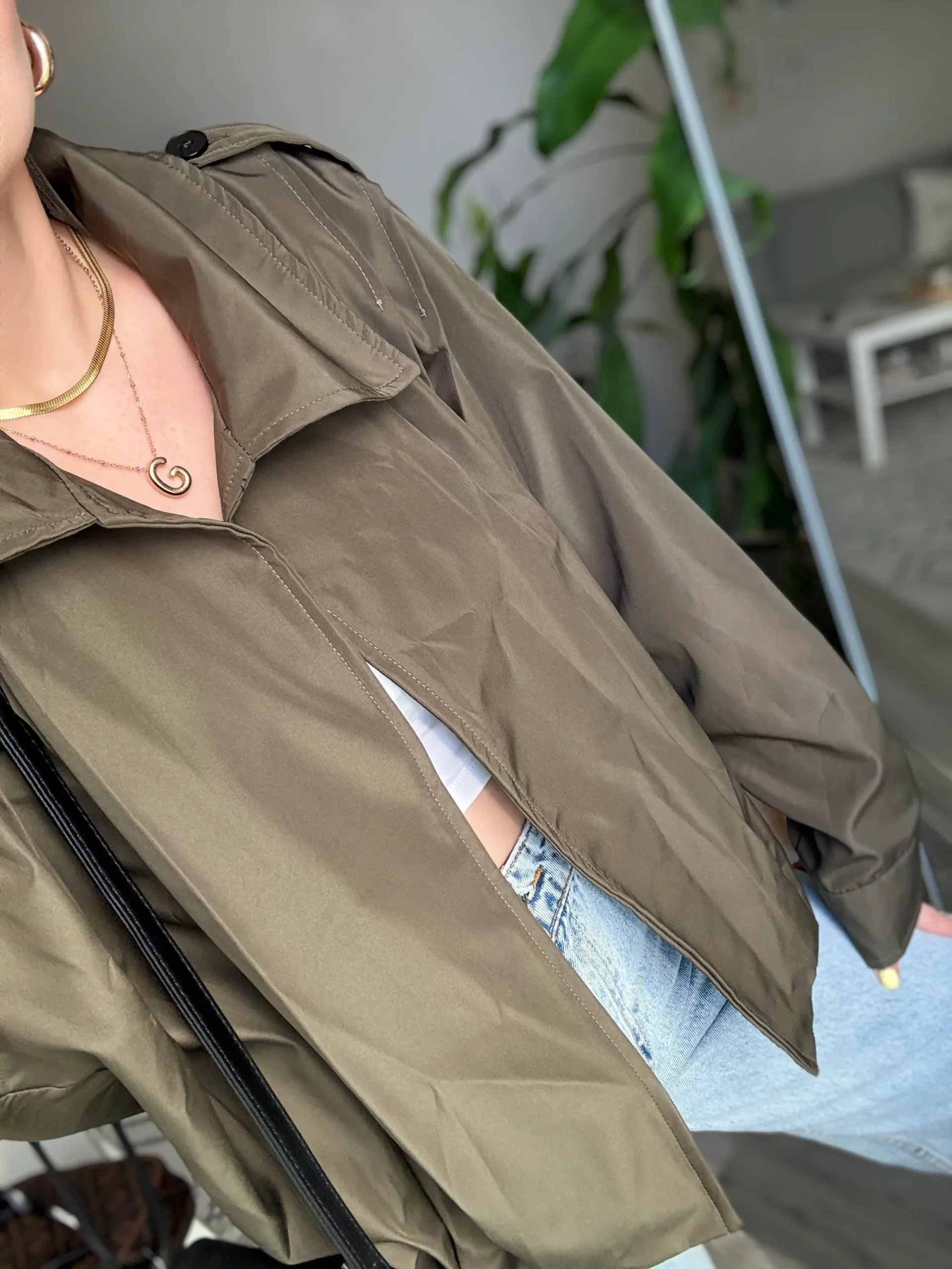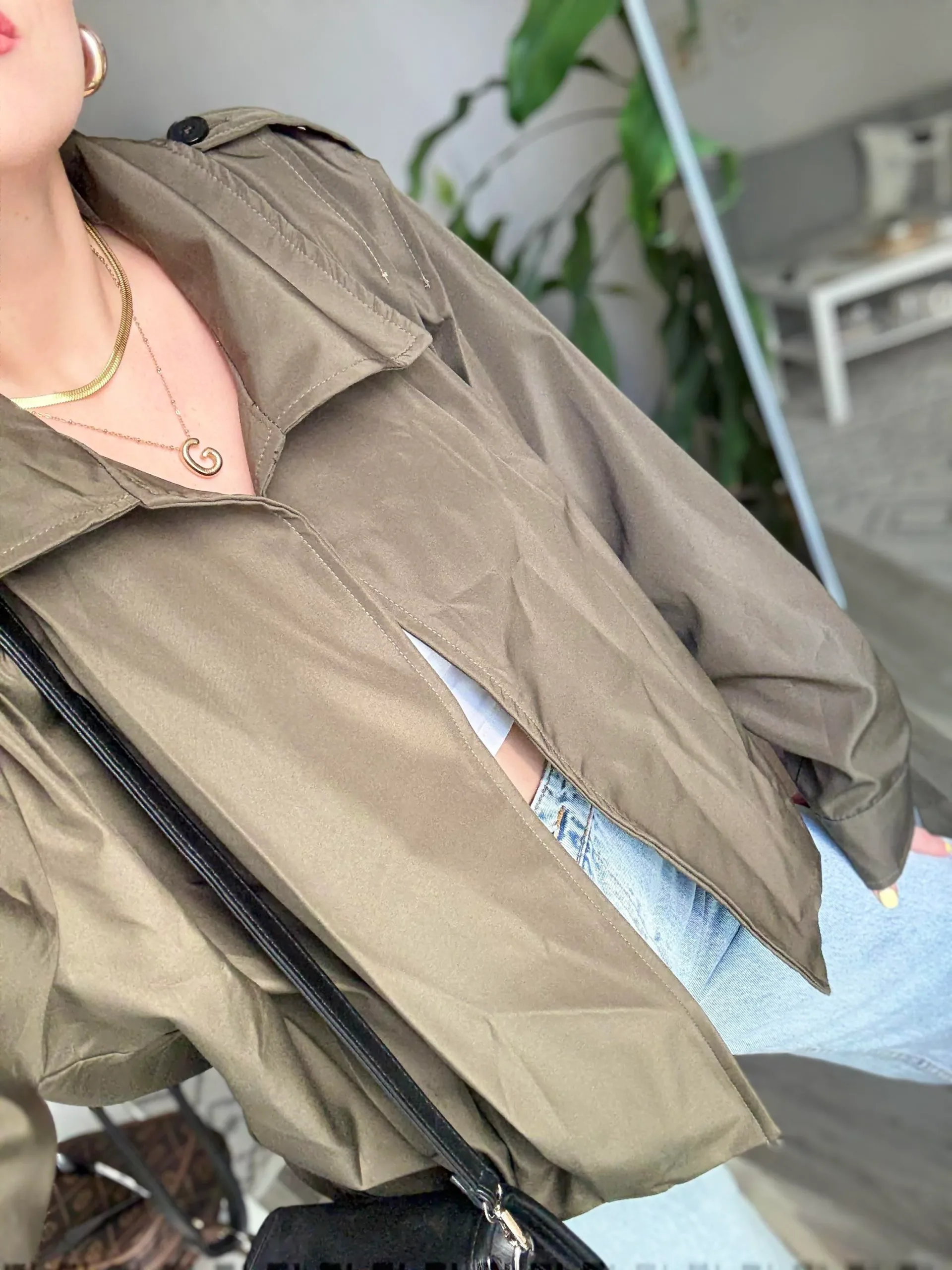 Modern kesimi ve su geçirmez kumaşıyla her mevsim stilini tamamlayan kısa bomber trenç.
